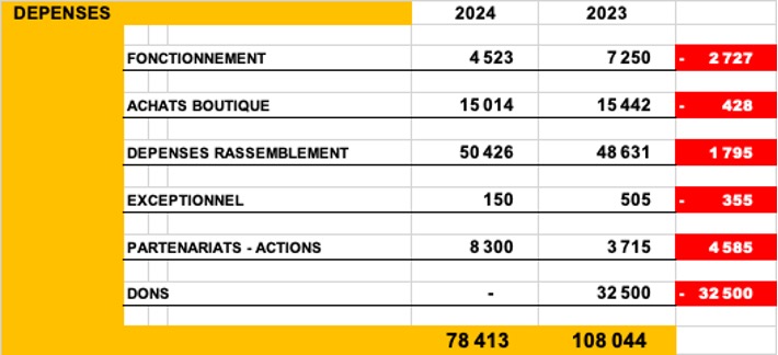 Pour la partie DEPENSES 2024, on peut noter : o Que les postes achats boutique et rassemblement sont stables. o Que les dépenses de fonctionnement, dépenses contraintes d’assurances, de coût de maintenance du site internet et des frais de banque sont en baisse uniquement car en 2023 le module inscription internet de notre site avait fait l’objet d’une mise à niveau. o Que le Poste Partenariat Actions inclut les éléments suivants :