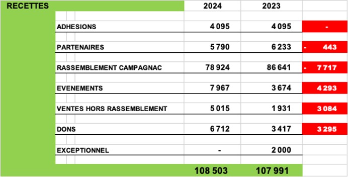 EXERCICES 2024 ET 2023 ![]() Pour la partie RECETTES 2024, on peut noter : o Que les postes Adhésions et Partenaires sont stables. o Que le poste Recettes Rassemblement est en baisse de 7.700 € compensés par l’augmentation des postes Dons et Ventes boutique hors rassemblement pour 6.300€. o Que le poste Evènements inclus un bénéfice de 1.000 € sur le weekend de l’association dans le Tarn et de 6.900 € sur la journée d’action pour Jules.